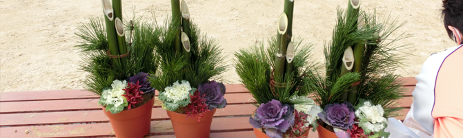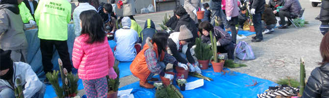 昨年好評を得た「ミニ門松づくり」を今年度は港中学校駐車場において12月14日(日)に実施しました。 今回は市長の激励のあいさつにはじまり、寒風の中、三世代63組150人あまりの参加者が一斉に取り組みました。材料の竹や松を収集し、束ねる準備に苦労したスタッフも手伝い、それぞれ一対の門松を完成させました。終了後、恒例となった女性スタッフによる温かい豚汁のサービスに舌鼓を打って行事を終えました。