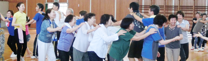 4年続けて行なわれてきた健康体操に、もう少し若い年代も呼び込もうと、今年は「ハッピースマイルヨガ」と銘打って、大人と子どもが気軽に笑顔でできる体操を三世代交流事業として企画しました。 7月1日、神社小学校体育館で、ヨガスタジオ「プラーナ」の藤原由佳里さんを講師に招き実施しました。 最初は「ヨガ」という言葉にやや引いていた方も藤原さんの楽しい誘導につられ老いも若きも楽しく体を動かすことができました。