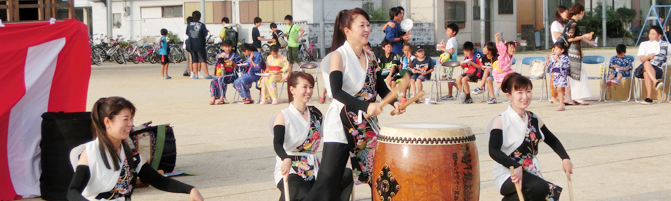 竹ケ鼻町有志による太鼓演奏は今年も大歓迎でした。 また、皇学館大学のよさこい部「雅」の22名の学生さんによる華麗な舞には会場から盛大な拍手がよせられるとともに、子どもたちとの共演もあり楽しいひと時でした