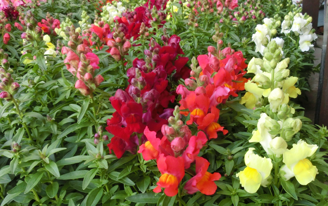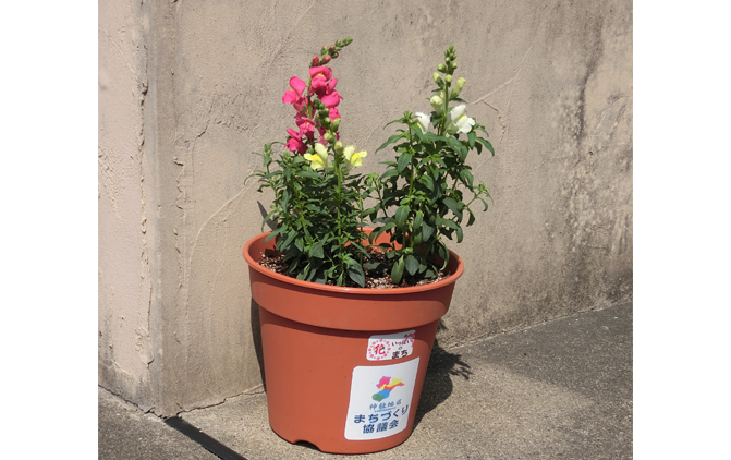 「花で飾ろうわが町」をスローガンに始められた町内を花で飾ろうという事業が3年目を迎えました。(27年度ペチュニア、28年度ベゴニア) 今回は赤、紫、黄色、白、ピンク等色とりどりの「金魚草」を3株セットする鉢を準備しました。 3月24日、5町の各公民館前で応募のあった265世帯の方にまちづくり協議会スタッフや自治会役員により手渡されました。 配布した花は通りから見えるところに配置していただき、きれいなまちづくりをめざします。