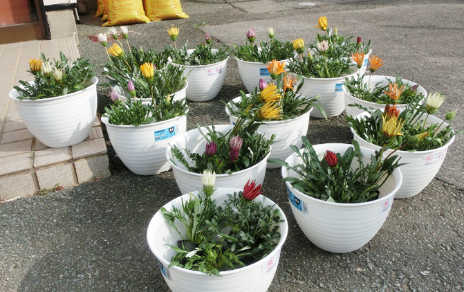 「花で飾ろうわが町」のスローガンのもと、今年も花苗を飾っていただく事業を実施しました。 今回は春から秋にかけて長期間咲く「ガザニア」を選びました。 3月23日、5町の公民館前で応募された294世帯の方に協議会スタッフや自治会役員により手渡されました。早速、通りに面した玄関などに配置していただきました。