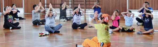 ヨガ、スタジオ「プラーナ」の藤原講師とスタッフ2名の指導のもと、6月8日、神社小学校の体育館で、 今回で3回目となるハッピースマイル、ヨガを開催しました。 高齢者の参加もあり、休憩をはさんでの約1時間の体操でしたが、リズムに合わせた全身運動、 体を動かす脳トレ体操、笑いの呼吸とストレッチ体操など、大人も子供も快い汗をかきながら楽しんだ 半日でした。