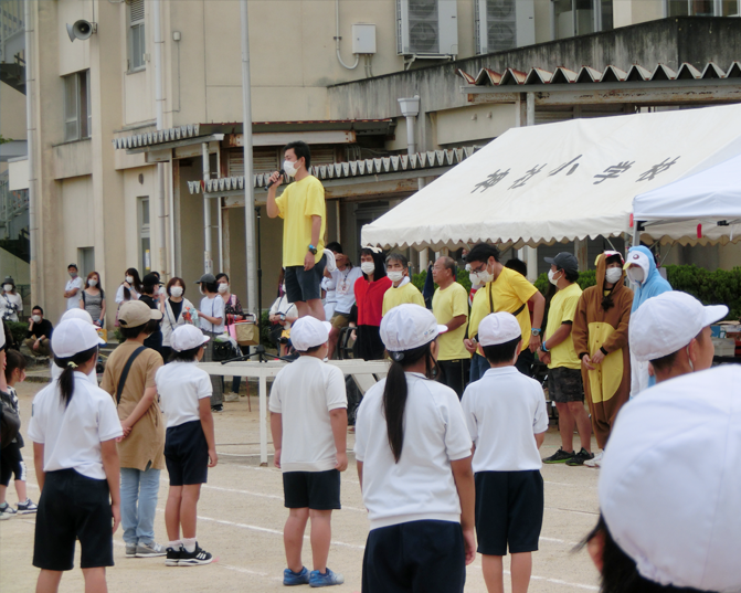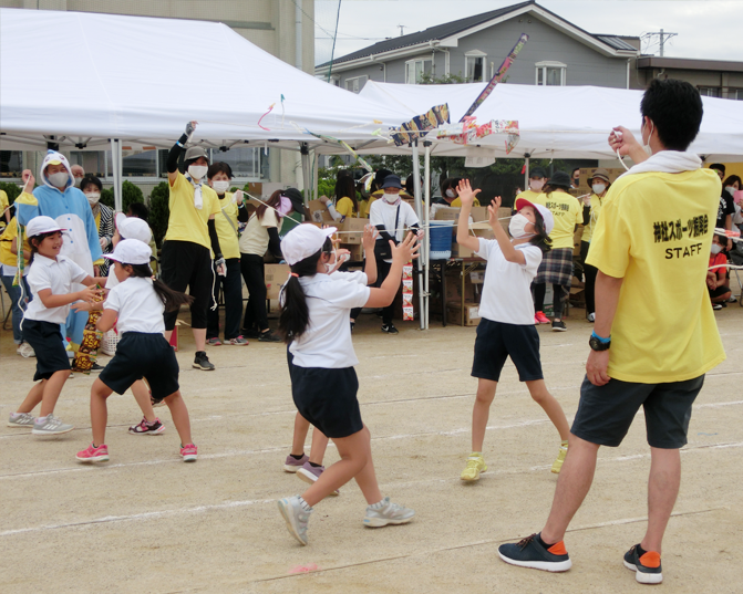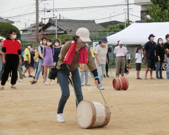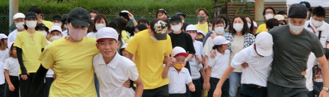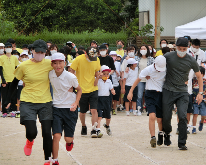 来年3月には、神社小学校と大湊小学校が閉校となり、4月からは、現在建設中の新小学校に統合されるため、神社小学校での町民運動会は今年が最後となりました。また、新型コロナウイルス感染防止のため、午前が小学校運動会、午後が町民運動会の合同開催となったため、幼児、児童、お父さん、お母さん、スタッフなど大勢の人が集まり、運動会は盛り上がりました。