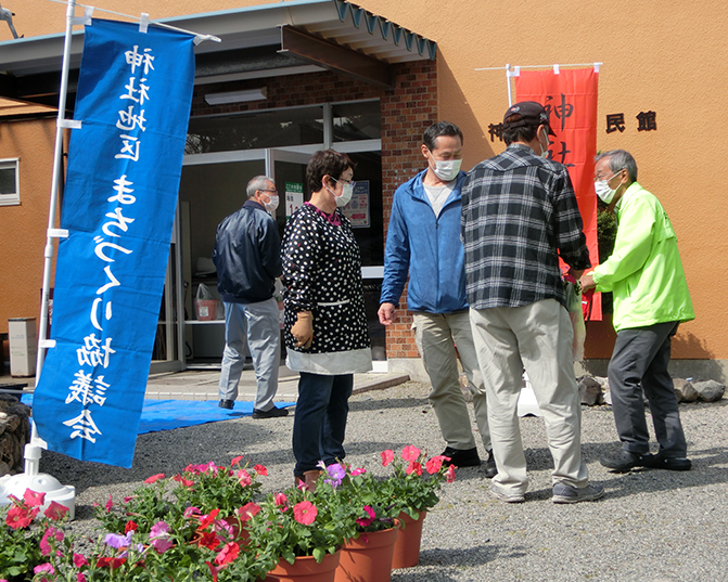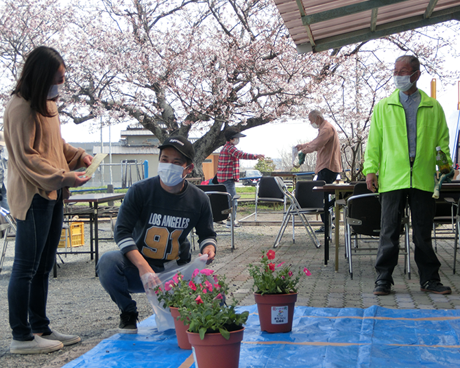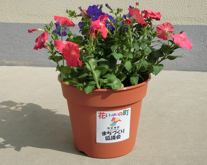 今年も、”花で飾ろうわが町”を合言葉に、「花いっぱいのまちづくり」活動を3月27日に開催しました。今年の花鉢には、夏の暑さに強く長く楽しめる「ペチュニア」を選び、応募のあった349世帯の方々に自治会役員や協議会スタッフより、5町の公民館前で赤、青。紫、ピンク、白などの鮮やかに咲く、花鉢を受取っていただきました。配布された花鉢を、玄関先や通りから見えるところに配置し、花いっぱいのまちづくりを目指します。