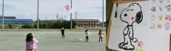 その後、いよいよ運動場で試し揚げです。前日の雨上がりのせいか、息をつく風の中での難しいタコ揚げとなりました。それでも、子ども達は夢中でタコ揚げに挑戦していました。