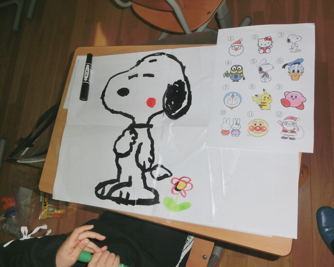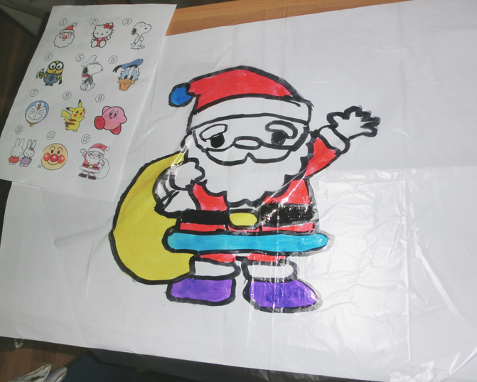 タコの本体となる透明のレジ袋に、油性マジックでそれぞれ好きな絵を描き、支柱となるストローをテープで貼り付け、最後に、しっぽを取り付けつなぎ糸を結んで、カラフルなタコの完成です。