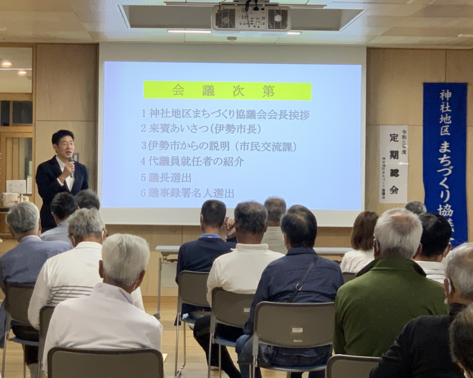 合計49名の参加となりました。伊勢市長のあいさつの後、市からまちづくり協議会活動の設立目的、